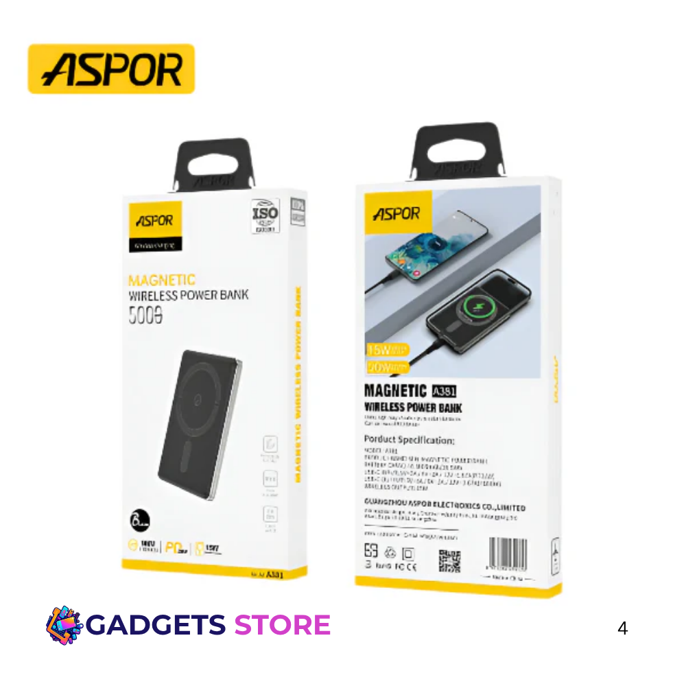 The Aspor A381 Magnetic Mini Power Bank is built for modern users seeking a powerful yet portable charging solution. Featuring a 5000 mAh (18.5 Wh) Li‑Polymer battery, it delivers efficient fast charging for smartphones and USB accessories.