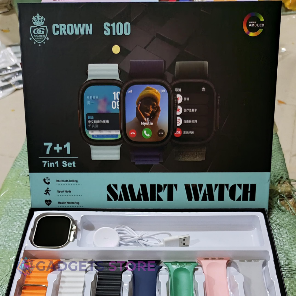 The Crown S100 Ultra is a modern smartwatch featuring a bright HD display, Bluetooth calling, smart health tracking, and multi-sport fitness modes—built for everyday convenience and style.