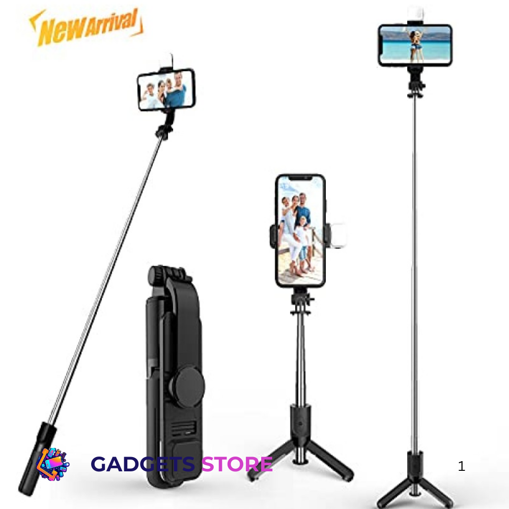 • 3-in-1 Design: Functions as a selfie stick, tripod, and LED light.